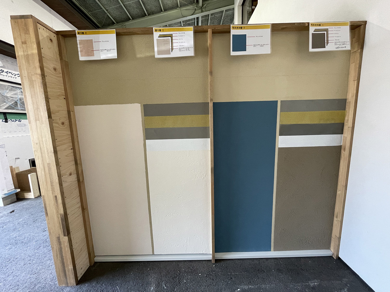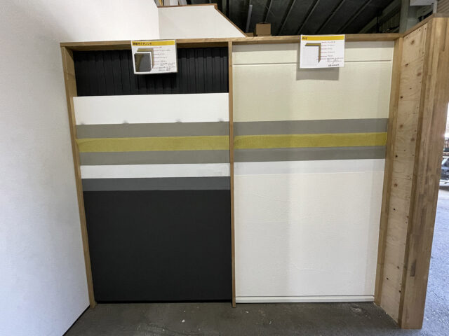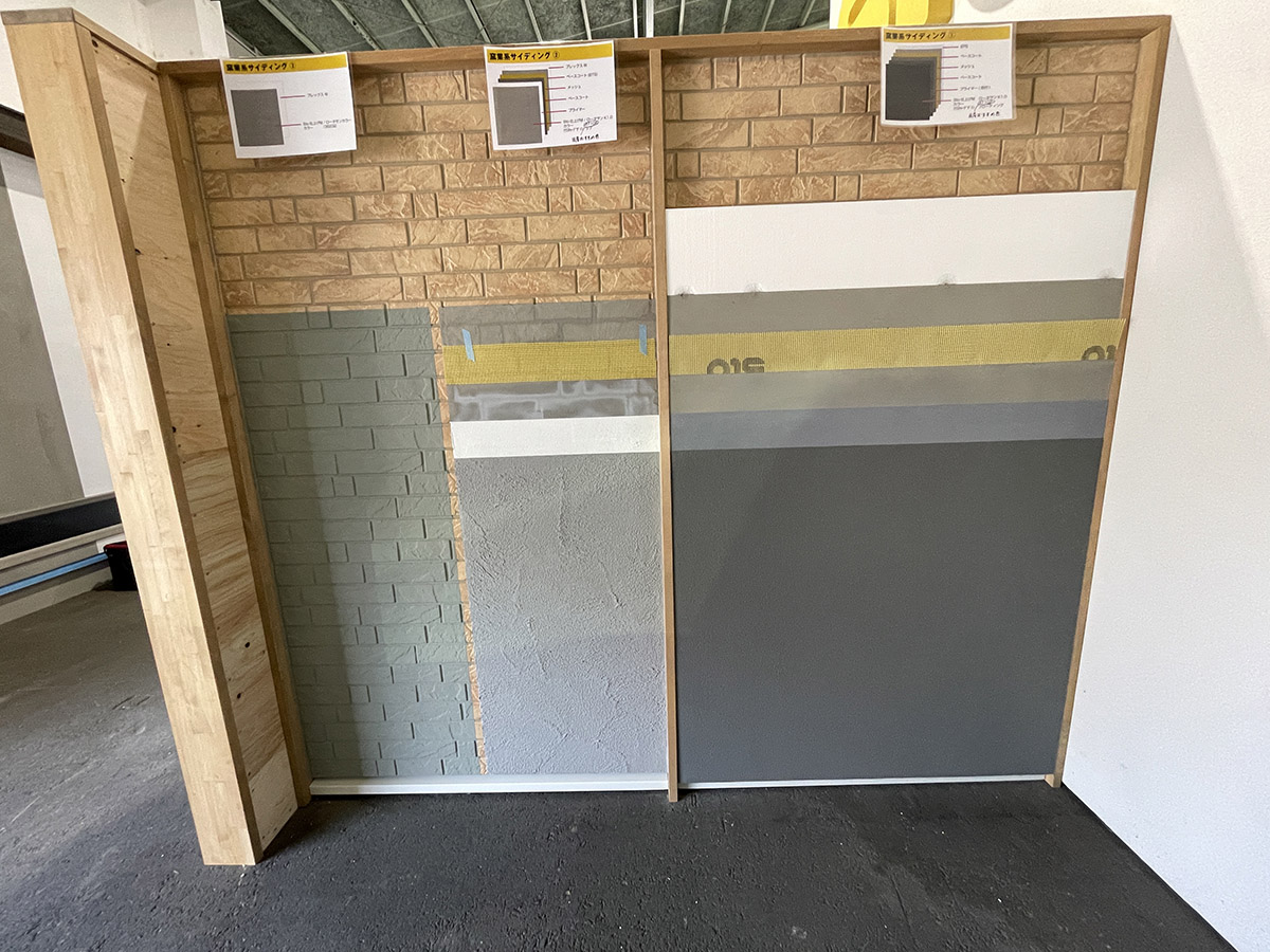 自社倉庫内に、実際に見て触れられる施工見本の壁が完成しました!