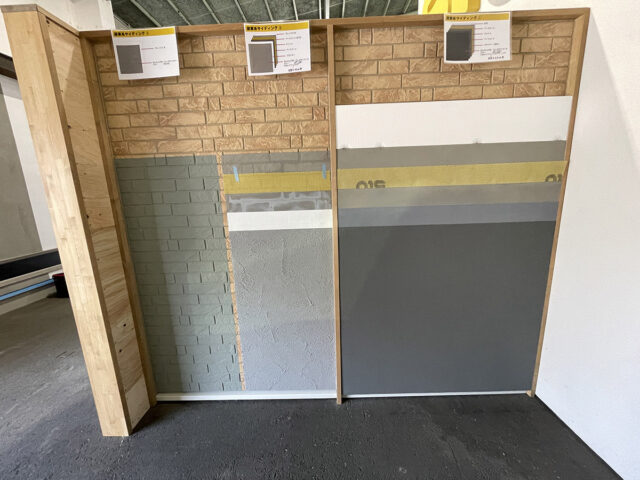 の、3種類の施工方法を組み合わせ、合計9つの見本壁が出来上がりました。